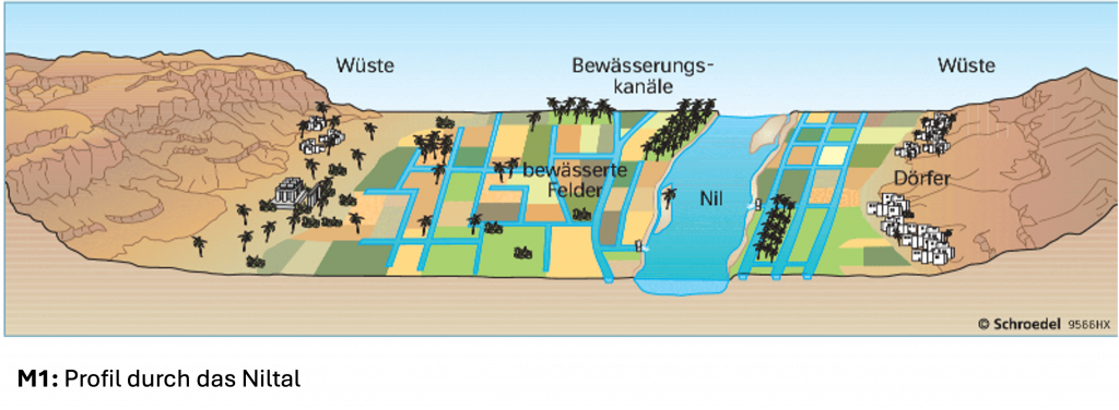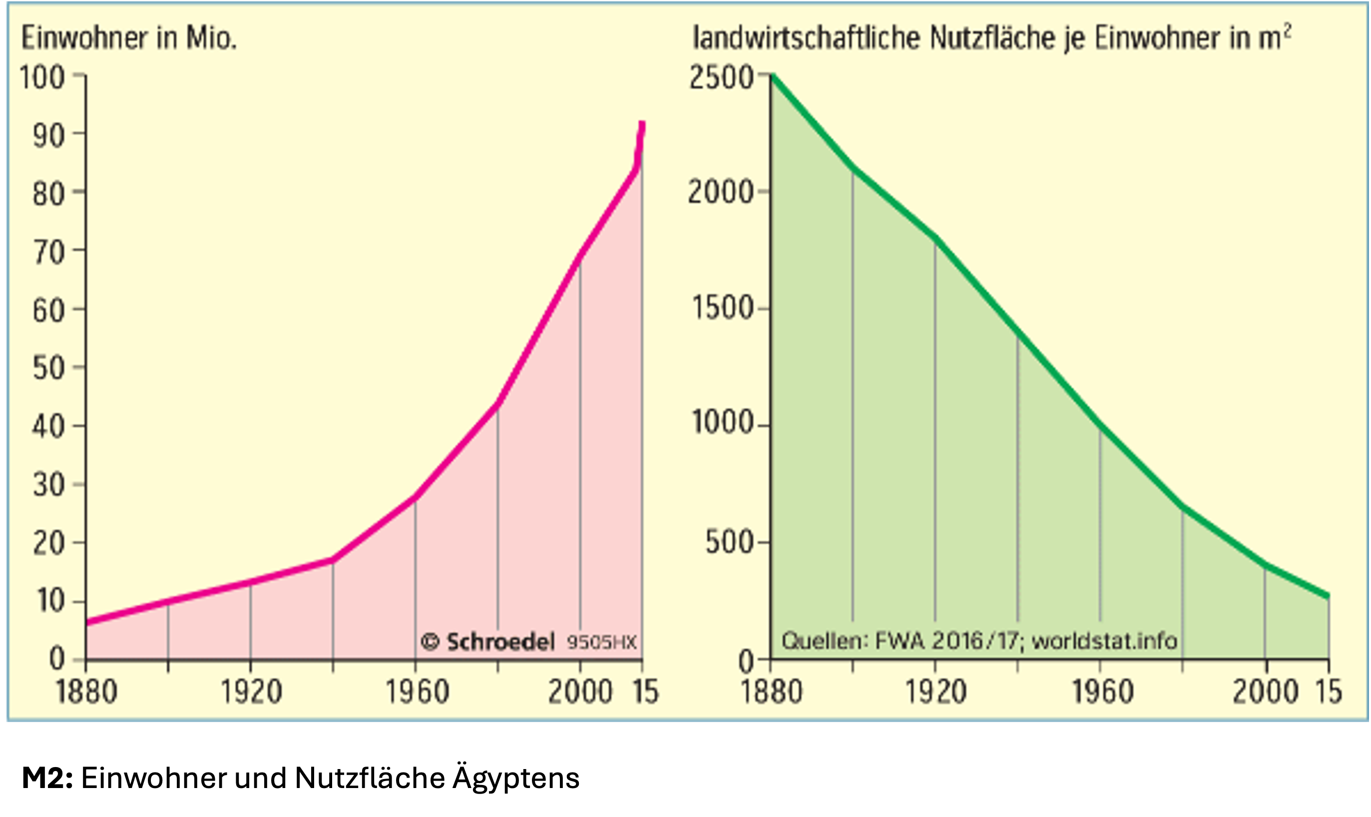 Erkläre den Zusammenhang zwischen Einwohnerzahl und Nutzfläche Ägyptens (M2).